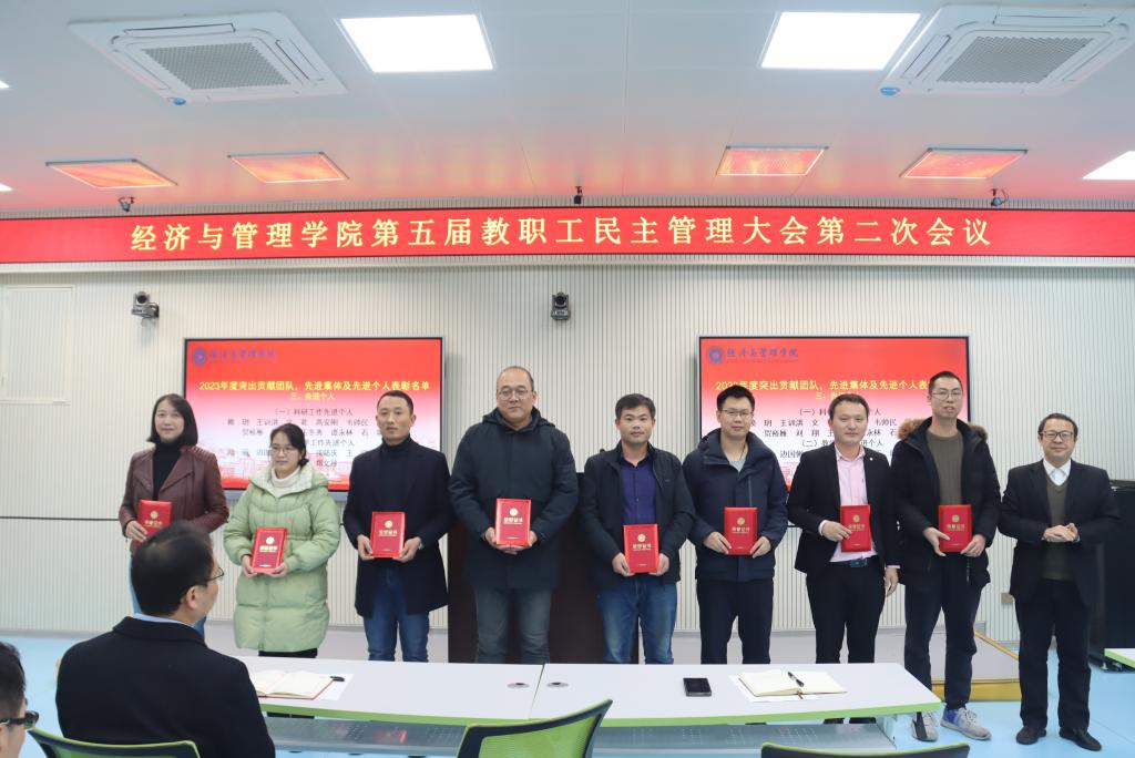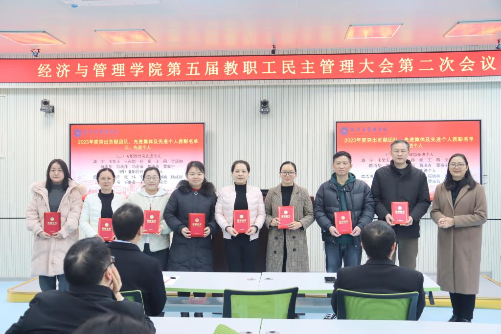 同时,学院还召开了教职工表彰大会。学院党委副书记、纪委书记韦齐齐宣读了《经济与管理学院关于表彰2023年度突出贡献团队、先进集体及先进个人的决定》,学院领导班子成员依次为获奖的2个突出贡献团队、7个先进集体和56名先进个人进行颁奖,赖玥老师代表突出贡献团队发言,边国俐老师代表先进个人发言,分别介绍了工作经验和感悟。