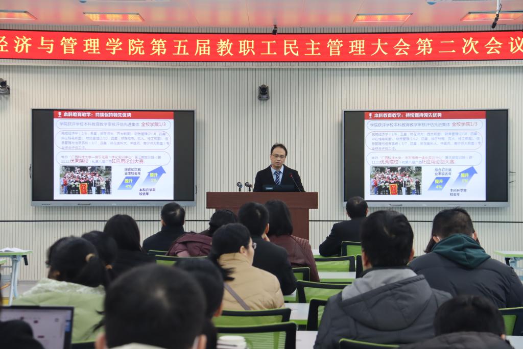 学院院长关勇军作《经济与管理学院2023年度工作报告》。报告全面回顾了2023年学院在教育教学、学科科研、学生管理和服务等方面的工作,客观全面、实事求是地总结了学院各项事业取得的成绩。《报告》还深入分析学院发展面临的形势与挑战,并明确提出了2024年学院工作的总体思路、主要任务和具体措施。关勇军还作了《经济与管理学院2023年行政经费使用报告》。报告详细总结2023年的行政经费收支情况,数字详实,科目完整。
