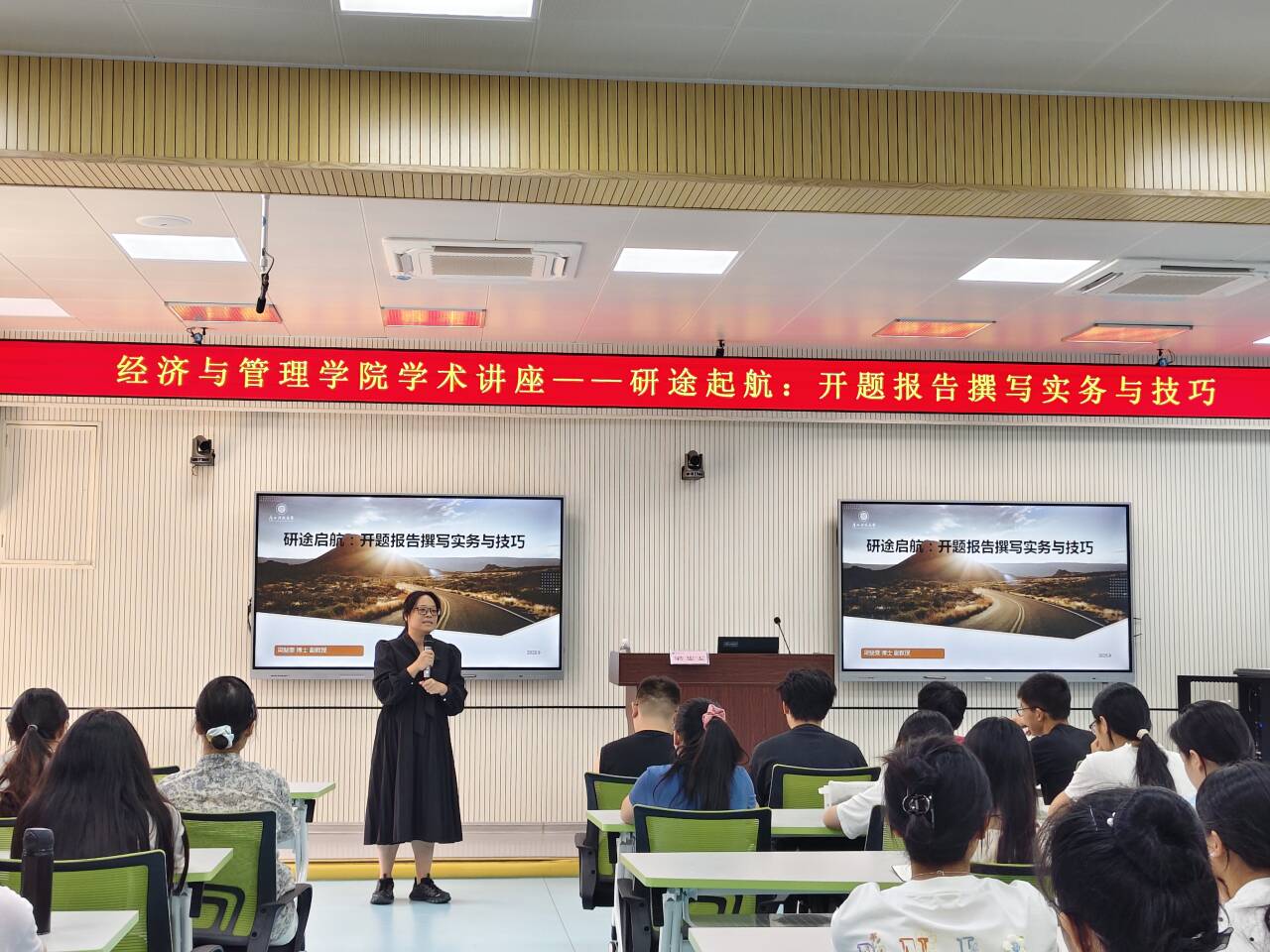9月23日下午,经济与管理学院在文昌校区第四教学楼4D403举办了“研途启航:开题报告撰写实务与技巧”为主题的研究生学术讲座。讲座由梁斐雯副教授主讲,经管学院2024级、2025级研究生及部分本科生到场聆听。