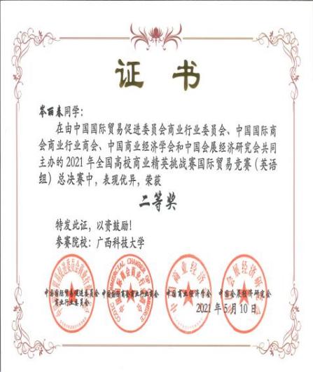 本专业是广西科技大学国际商务专业学位硕士授权点的重要支撑,拥有《国际贸易实务》国家级一流本科课程,广西专业综合评估获“四星”等级,主持获得广西高等教育教学成果二等奖1项、三等奖1项,专业核心课程《国际贸易实务》教学团队入选自治区级普通本科高校基层教学组织。本科生就业率位居学院前列,英语四级通过率达80%,开办成班制留学生班,探索形成了“实训竞赛促进学习、产业商贸实践育人”的国际经贸人才培养特色模式。