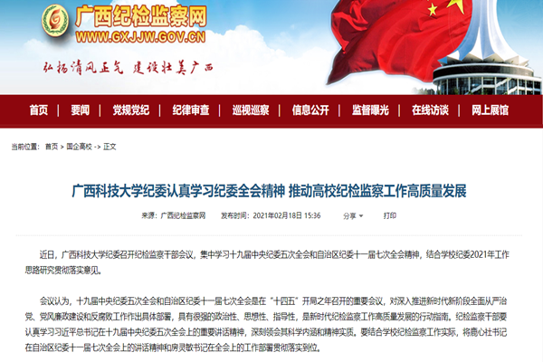 2月18日,广西纪检监察网以《广西科技大学纪委认真学习纪委全会精神 推动高校纪检监察工作高质量发展》为题报道我校纪委认真学习纪委全会精神,全文如下:
