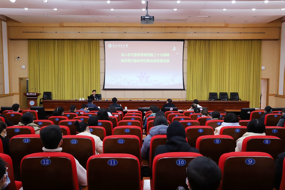 12月16日,学校党委常委、纪委书记黎东在文昌校区多功能报告厅宣讲党的二十大精神,统战部、党政办、纪委办、监察处、巡察办和启迪数字学院的全体党员干部和教职员工参加宣讲会。校党委常委、统战部部长、党政办主任卢志平主持宣讲会。