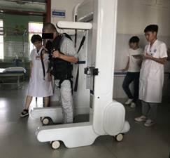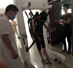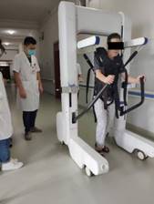 2019年,本团队所研制的移动式下肢康复机器人已在广西科技大学第一附属医院等医疗机构开展了针对偏瘫、脑卒中患者下肢康复训练的临床试用,多名行走障碍患者通过康复训练后其平衡等级从1级提升至2、3级,部分患者已成功出院。其中1位为已卧床18个月、完全无法站立的佝偻病患者借助下肢外骨骼康复机器人开展行走训练,借助机器人该患者已开展直立行走训练,康复意愿明显增强;1位借助康复机器人的减重和移动功能开展主动运动康复训练的偏瘫患者,其徒手肌力和站位平衡明显增强,康复训练1周后已成功出院;1位开颅和左腿骨骼手术患者,其入院时徒手肌力4-,徒手站位平衡不足1级,Berg量表评分6分,左侧肢体协调少,无法站立行走。经过2周的康复训练后,其徒手肌力4+,徒手站位平衡2级,Berg量表评价33分,已能够独立步行,并顺利出院。