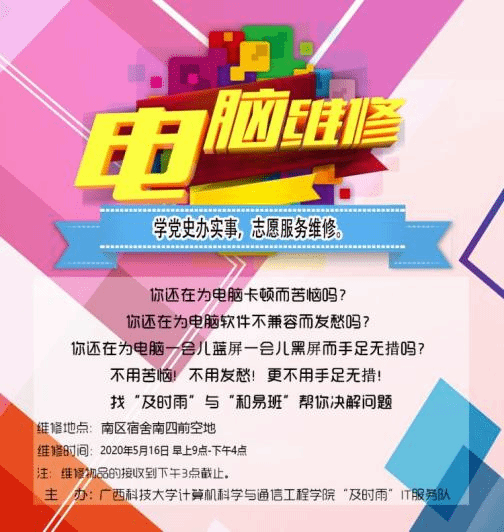 为深入践行“学党史、悟思想、办实事、开新局”部署要求,培育和践行社会主义核心价值观,营造良好的校园志愿服务氛围,大力弘扬奉献、友爱、互助、进步的志愿精神。5月16日,计通学院IT服务队开展了“学党史 办实事”免费为广大师生维修电脑志愿服务活动,旨在引导计通学子学党史守初心,志愿服务办实事,争做新时代优秀青年。