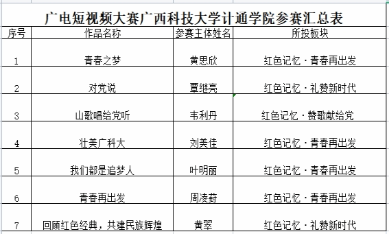 在全国上下深入开展党史学习教育、迎接建党100周年之际,根据广西壮族自治区广播电视局关于举办“红色记忆·唱支山歌给党听”第三届“三月三”网络短视频大赛的通知要求,为进一步引领广大学生铸牢中华民族共同体意识,弘扬和展示中华优秀民族文化和红色经典文化,用短视频讲好中国故事、党的故事,计通学院在3月1日至5月10日举办“红色记忆·唱支山歌给党听”短视频选拔赛。