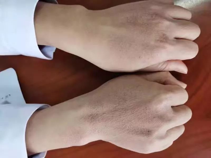 队员摘掉口罩和帽子后脸部留下深深的压痕