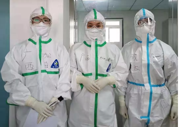 来自第一临床医学院(第一附属医院)的队员吴妮、潘慧玲、梁柳婷,在武汉黄陂区中医医院病房配合开展工作。她们说,进入病区前所有人必须穿好防护服,防护服上写有名字,便于称呼和寻找。穿着防护服工作时,动作幅度要小,特别是向上伸手或是下蹲最好不抬头,以避免下巴暴露。在抢救时更要注意,防止防护服被勾破。有个别队员对乳胶过敏,必须戴双层手套,下班脱下手套时双手都已发红。