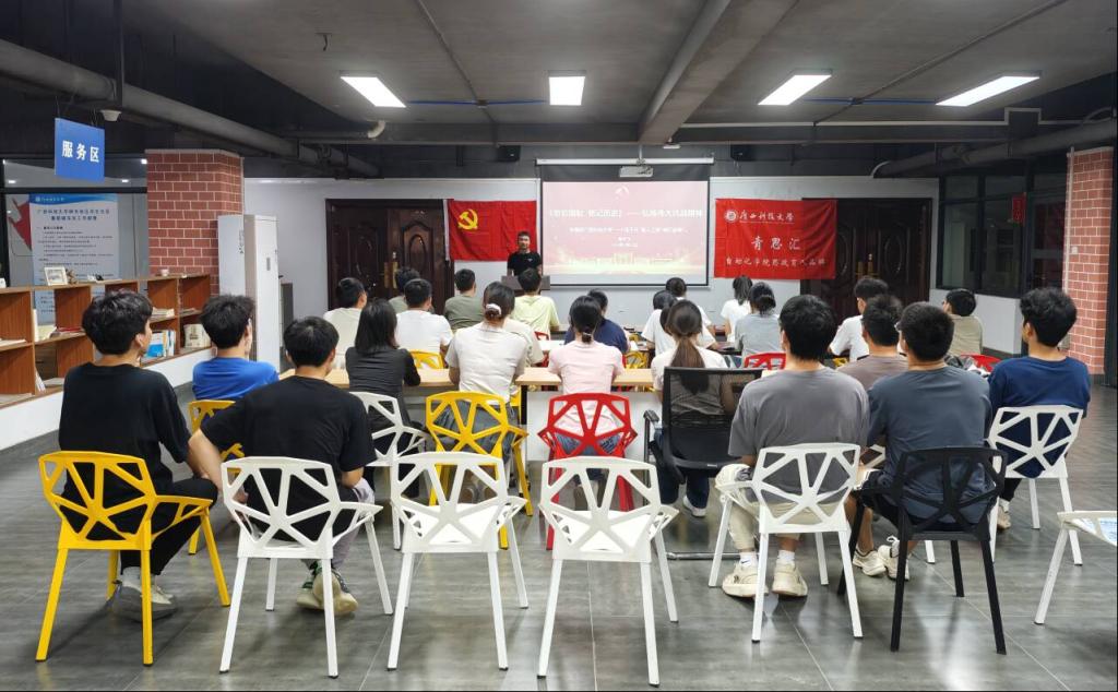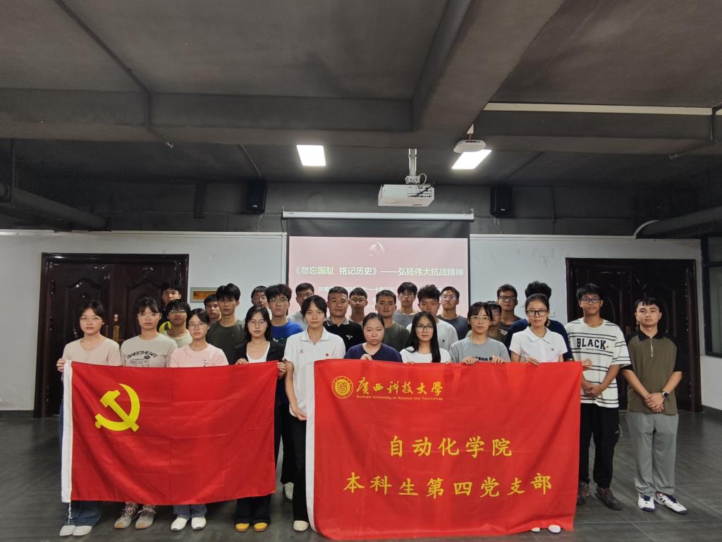 2025年9月22日,自动化学院本科生第四党支部于柳东校区H7“一站式”党员活动室开展“勿忘国耻 铭记历史——弘扬伟大抗战精神”主题党团课。党课由党支部书记陈平飞老师主持,支部全体成员参与。本次党课旨在结合中国人民抗日战争暨世界反法西斯战争胜利80周年契机,强化党员历史认知,弘扬伟大抗战精神。