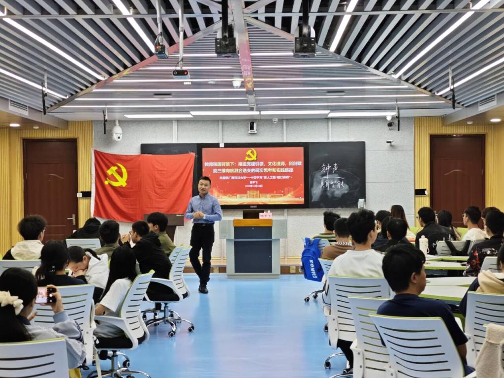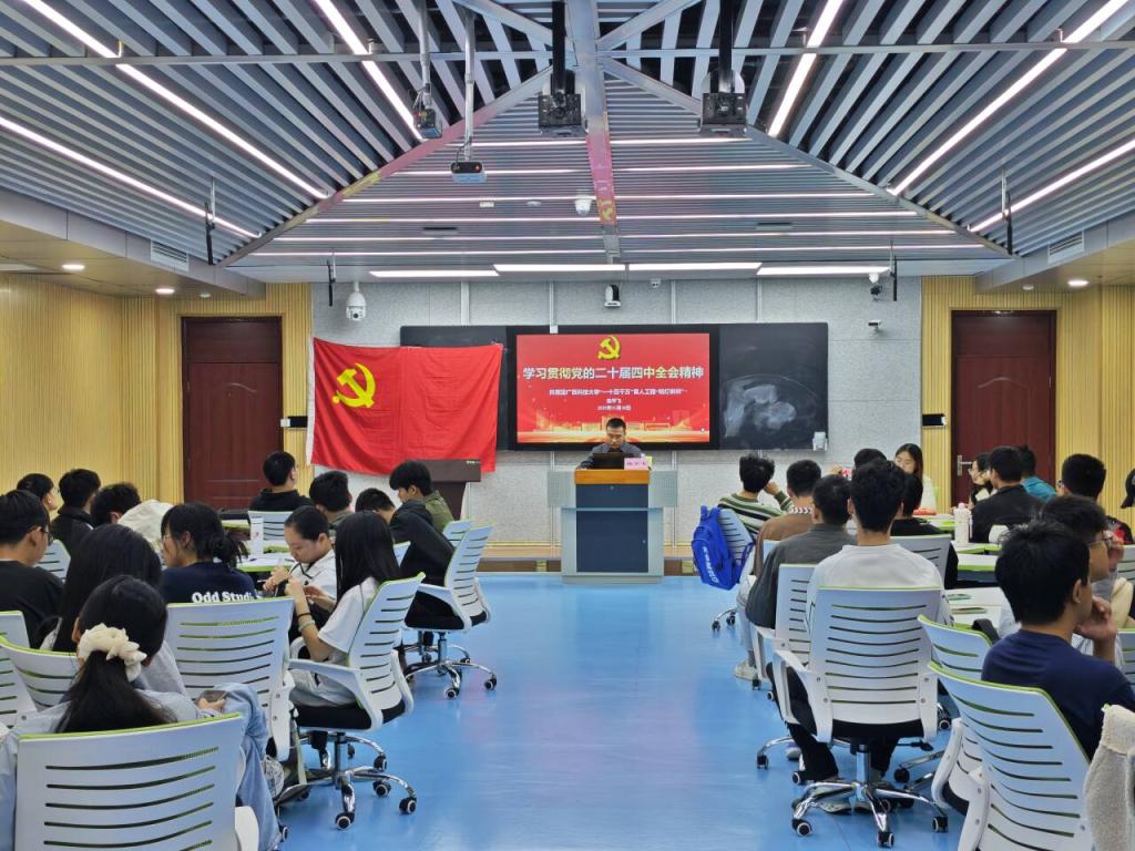 2025 年12月5日,自动化学院(人工智能学院)党建办与科教智创党支部在柳东“一站式”学生社区联合举办 “学习贯彻党的二十届四中全会精神” 主题党课。本次党课由共青团广西科技大学 “一十百千万” 育人工程 “明灯讲师”、科教智创党支部书记陈平飞主讲,自动化学院党建办主任殷若诚、学院党建办全体成员、科教智创党支部全体党员及发展对象共同参与学习。