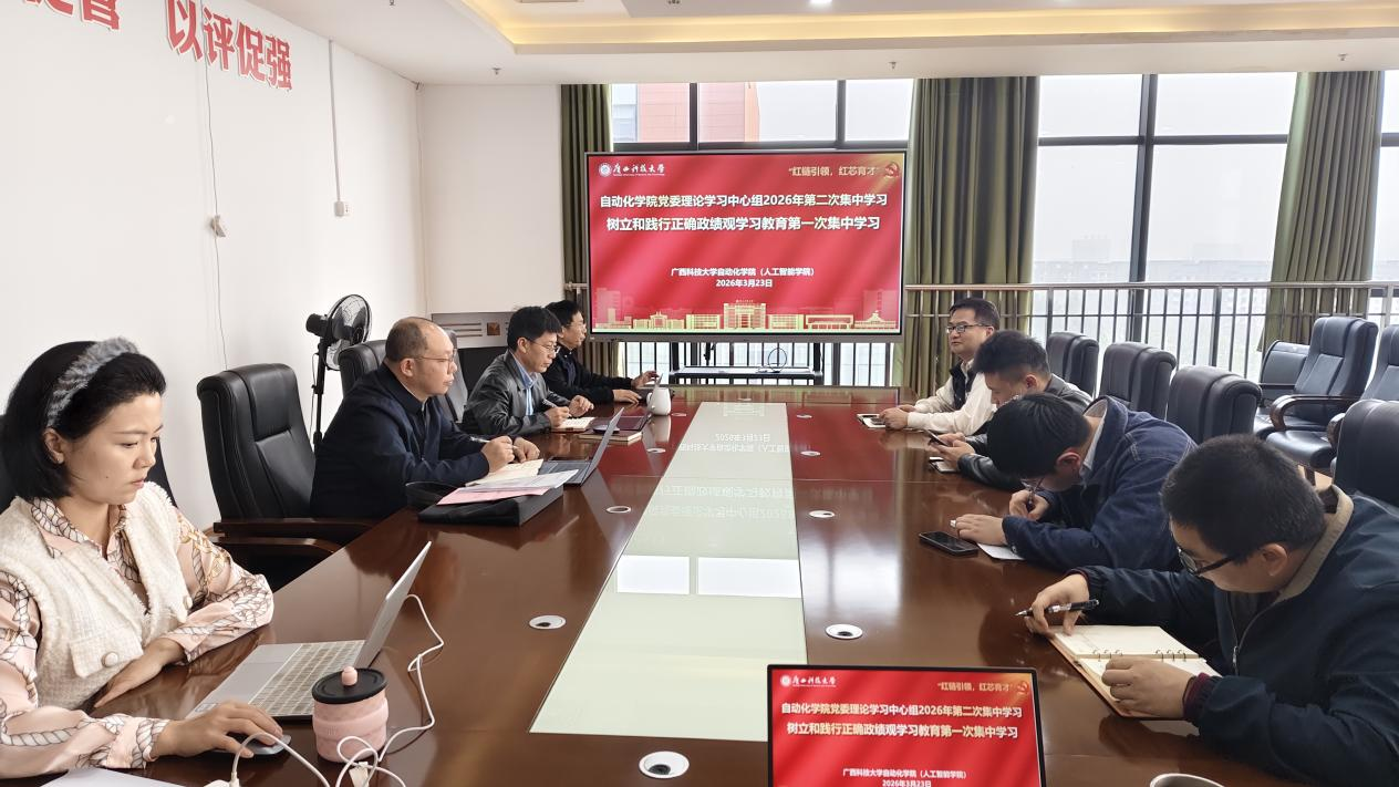 2026年3月23日上午,自动化学院党委理论学习中心组2026年第一次集中学习在柳东校区L2—514会议室举行。本次学习主题为深入学习贯彻习近平总书记在全国两会期间的重要讲话和全国两会精神,开展树立和践行正确政绩观学习教育,以优良作风推动学院高质量发展。