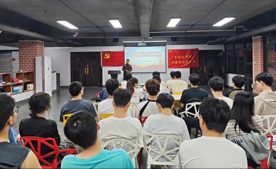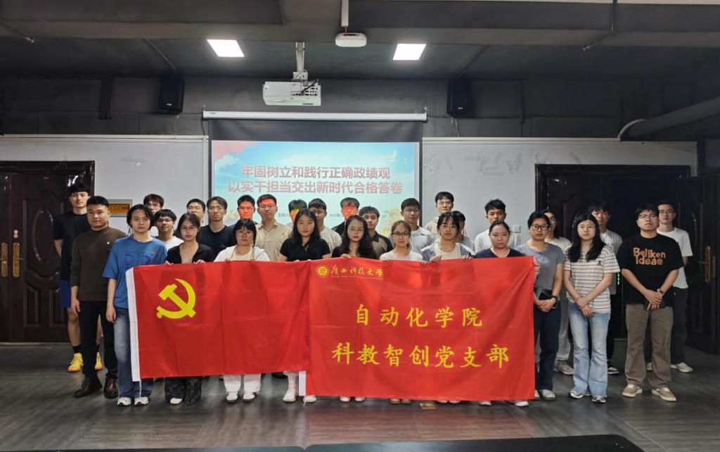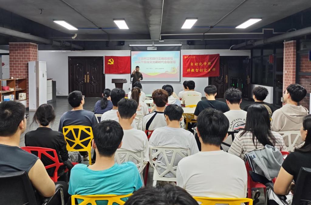 2026年3月30日,自动化学院科教智创党支部在H7“一站式”学生社区开展“牢固树立和践行正确政绩观,以实干担当交出新时代合格答卷”专题党课。党课由支部书记陈平飞主讲,支部全体党员参加。