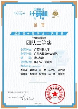 本次比赛,我校“广科大萌新门槛”队获得全国团队三等奖,我院软件193班的黄其锭获得全国个人二等奖,软件192班的吴水清、计科201班的曾航获得全国个人三等奖;此外,我校代表队还获得广西赛区高校特等奖,“广科大萌新门槛”队和“广科大天梯赛氛围队”获得广西赛区团队一等奖,“广科大提交什么都队”获得广西赛区团队二等奖。