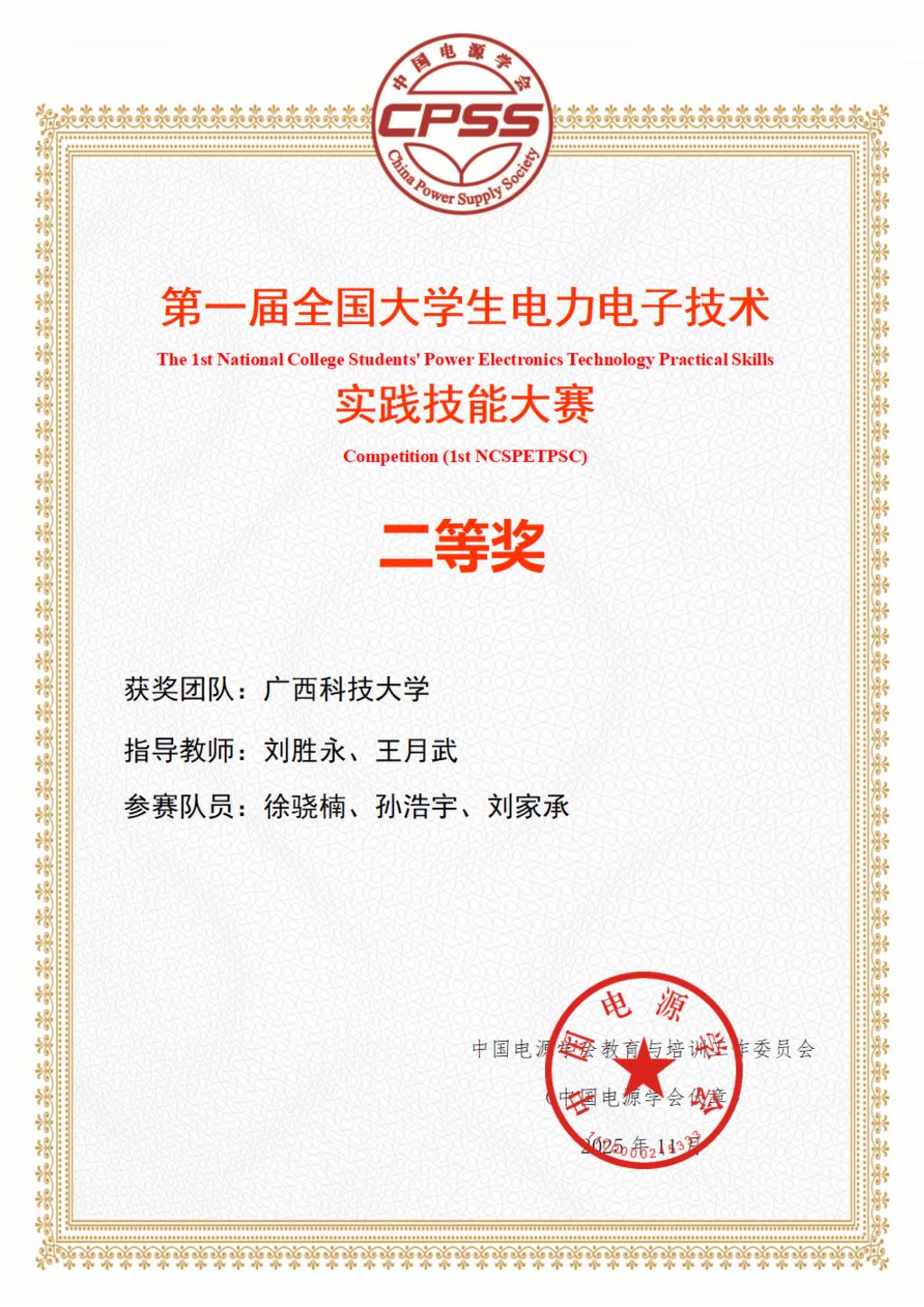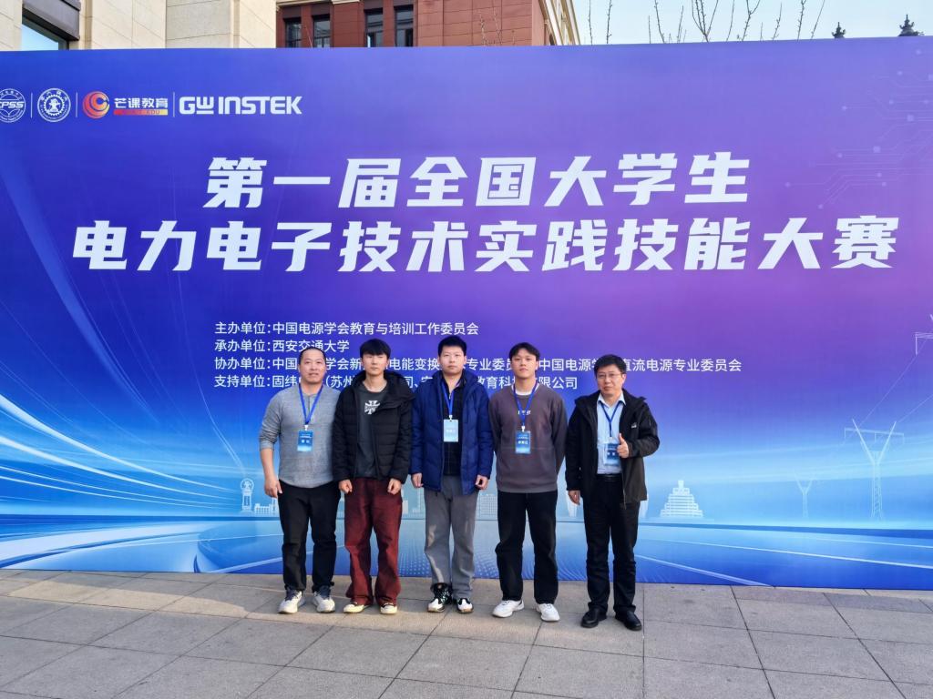 2025年11月30日,第一届全国大学生电力电子技术实践技能大赛决赛在西安交通大学创新港校区圆满落幕。在自动化学院刘胜永院长、王月武教师的指导下,由电气工程及其自动化专业学生徐骁楠、孙浩宇、刘家承组成的参赛团队凭借扎实的专业功底和出色的实践能力,从全国225支参赛队伍中脱颖而出,斩获全国二等奖,充分展现了学院应用型人才培养的显著成效。