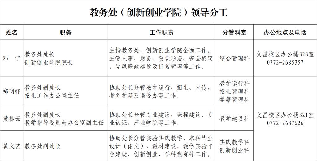 地址:广西柳州市城中区文昌路2号广西科技大学教务处(创新创业学院) 邮编:545006 电话:0772-2687652; 邮箱:jwc@gxust.edu.cn