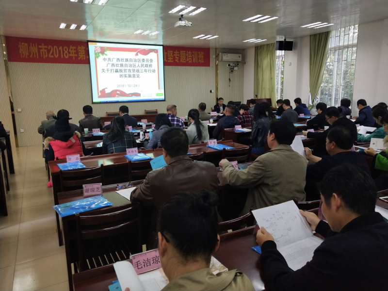 2018年11月29日上午,柳州市2018年第二期扶贫系统干部脱贫攻坚专题培训班在广西干部教育培训广西科技大学基地举行。来自柳州市各县区扶贫办公室的领导干部共74人参加了本次专题培训班。此次培训诚邀了柳州市委讲师团、市农业局、市发改委、市扶贫办的专家学者,开展了“习近平总书记关于扶贫工作的重要论述”、“柳州市当前脱贫攻坚主要工作和脱贫攻坚考核评估方式”、“《中共广西壮族自治区委员会 广西壮族自治区人民政府 关于打赢脱贫攻坚战三年行动的实施意见》解读”、“产业扶贫主要内容及案例分析”、“扶贫领域廉洁和作风教育”、“基础设施项目建设要求和实施办法”、“移民搬迁政策解读”、“扶贫培训和社会扶贫工作要点及工作方法”等方面的专题讲座。