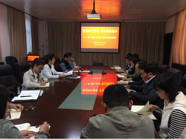 2019年10月30日,继续教育学院党总支召开“不忘初心、牢记使命”主题教育理论中心组学习。学院党总支书记黄殿芳主持专题学习会,全体理论中心组成员参加集中学习。会议重点学习了自治区党委书记、人大常委会主任鹿心社2019年10月12日在广西大学形势与政策报告会上的讲话精神。