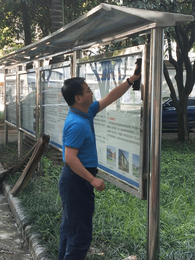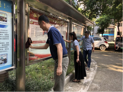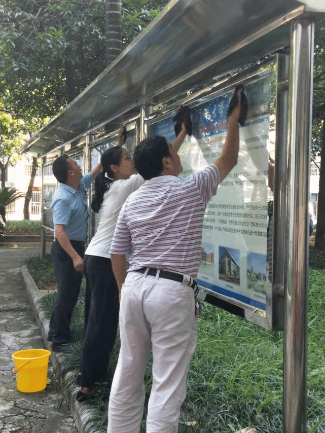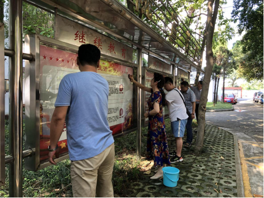 在党总支书记黄殿芳和学院院长韦鸿鹏的带领下,所有党员同志和入党积极分子顶着烈日,不畏酷暑,分别拿着抹布、扫帚、水桶、垃圾铲等工具,在第一教学楼四周开始了清洁劳动。大家自行分组分工,打扫、擦宣传栏、清理枯枝,各司其职、各尽所能、相互配合,迅速美化了学院的办公环境。