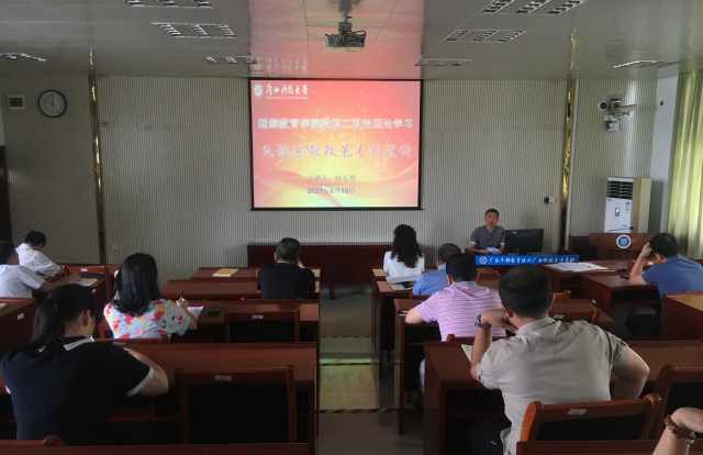 6月18日,继续继续教育学院召开民族教育政策专题宣讲会。宣讲会由学院分管该项工作的党总支副书记林东榕主讲,院长韦鸿鹏、副院长杨胜、陈有禄、全体教职员工参会。学院党总支书记黄殿芳主持宣讲会。