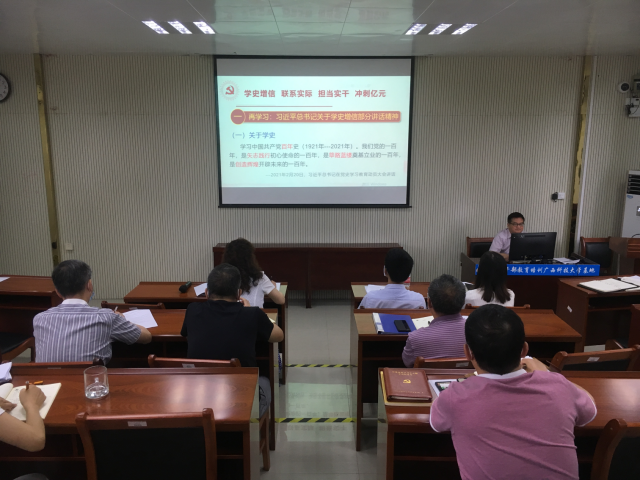 6月21日,继续教育学院召开党史学习教育第五次专题宣讲会暨2021年党员第九次党课。学院院长韦鸿鹏作专题宣讲。副书记林东榕、副院长杨胜、陈有禄、学院全体教职工、全体党员参加宣讲会。党总支书记黄殿芳参加并主持。