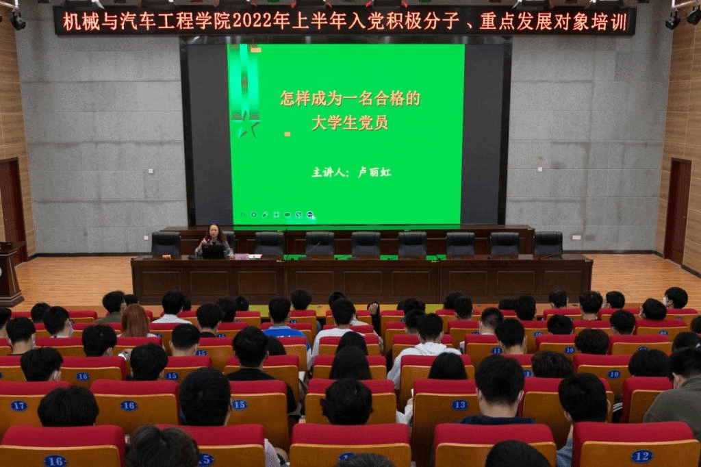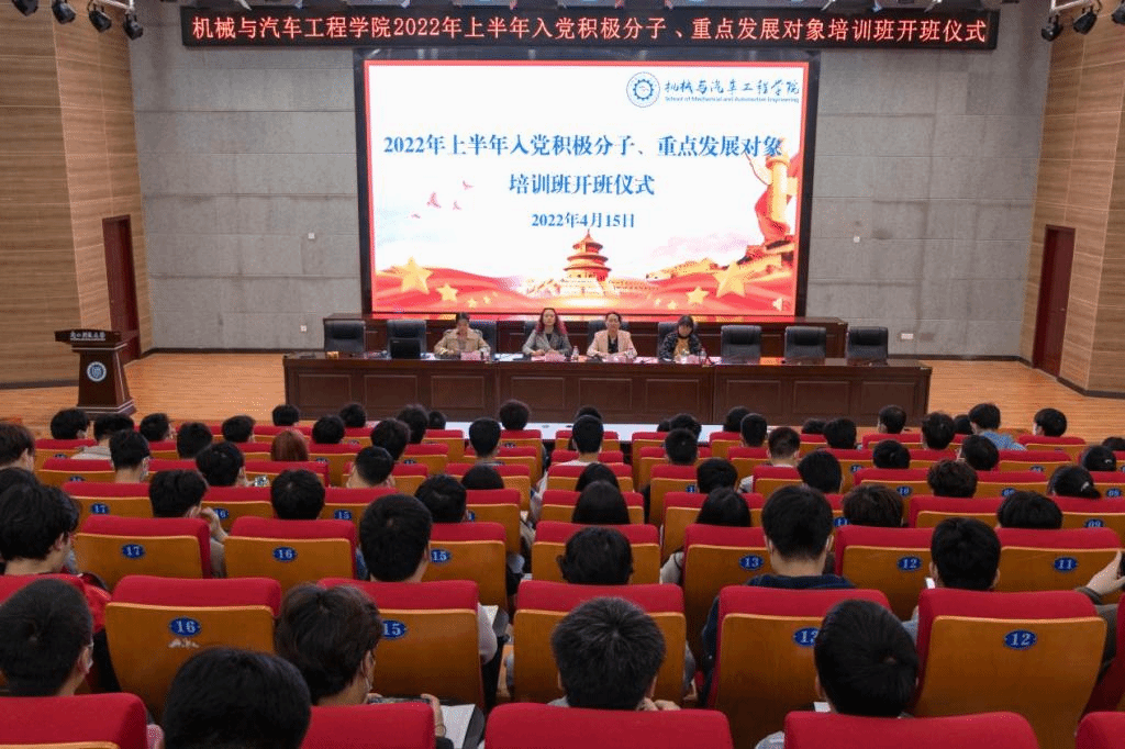 2022年4月15日晚上,机械与汽车工程学院党委分党校2022年上半年入党积极分子、重点发展对象培训班开班仪式在柳东校区多功能报告厅T1-303顺利举行,学院党委书记卢丽虹,学院党委副书记、纪委书记何敏,专职组织员谢薇出席,全体学员参加开班仪式,开班仪式由学院负责党建工作辅导员李伟青主持。