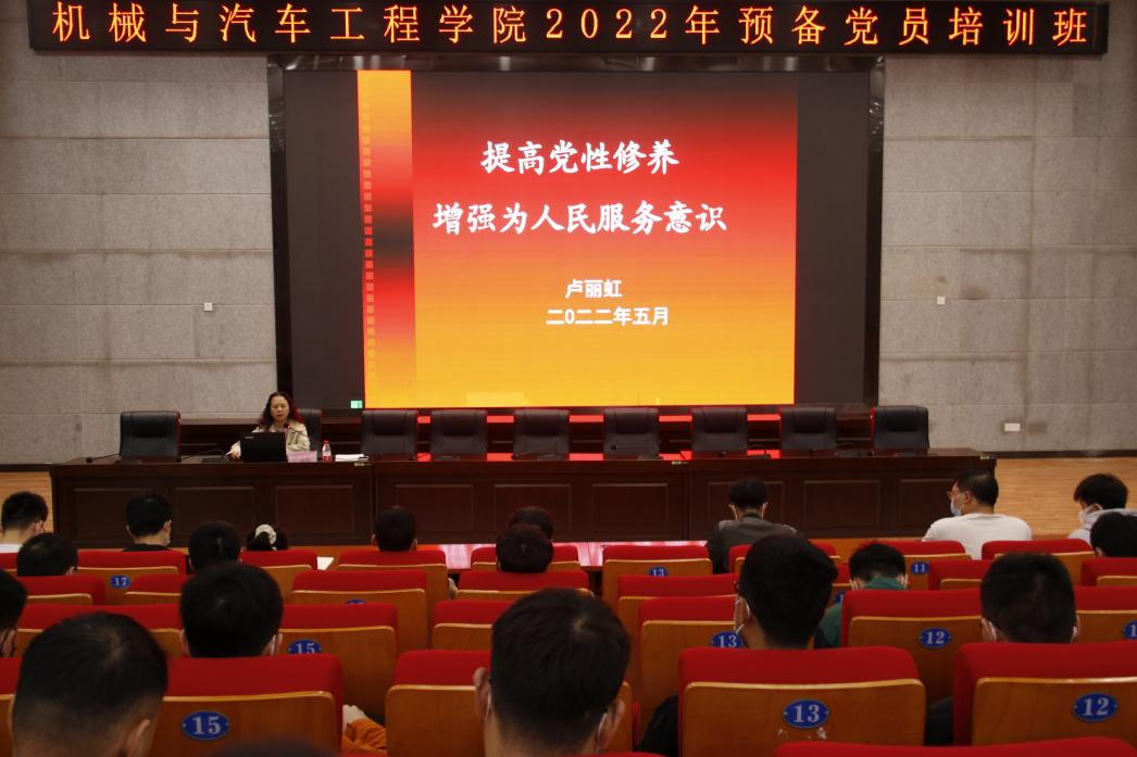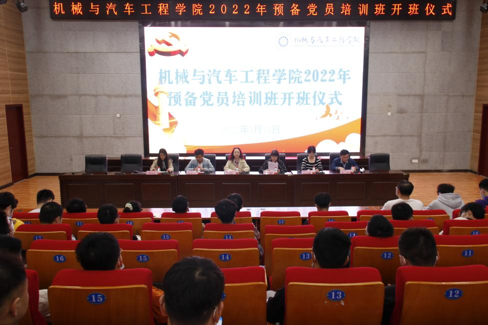 为深入学习贯彻习近平新时代中国特色社会主义思想,提升预备党员的马克思主义理论素养,筑牢预备党员的思想根基,5月15日上午,机械与汽车工程学院党委在柳东校区T1-303多功能报告厅举行2022年预备党员培训班开班仪式,学院党委书记卢丽虹、专职组织员、党委分党校成员和近300名预备党员参加本次开班仪式,开班仪式由学生党建负责老师李伟青主持。