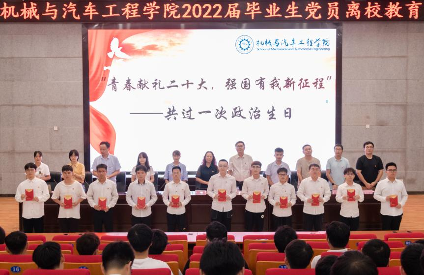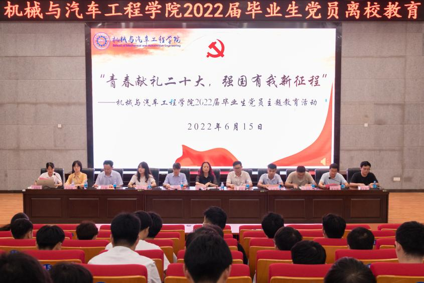 2022年6月15日晚上,机械与汽车工程学院党委在柳东校区多功能报告厅举行2022届毕业生党员“青春献礼二十大,强国有我新征程”为主题的“五个一”系列教育活动。学院党委委员、专职组织员、党支部书记出席了活动,2022届本科、研究生毕业生党员参加了活动,活动由党建工作负责老师李伟青主持。