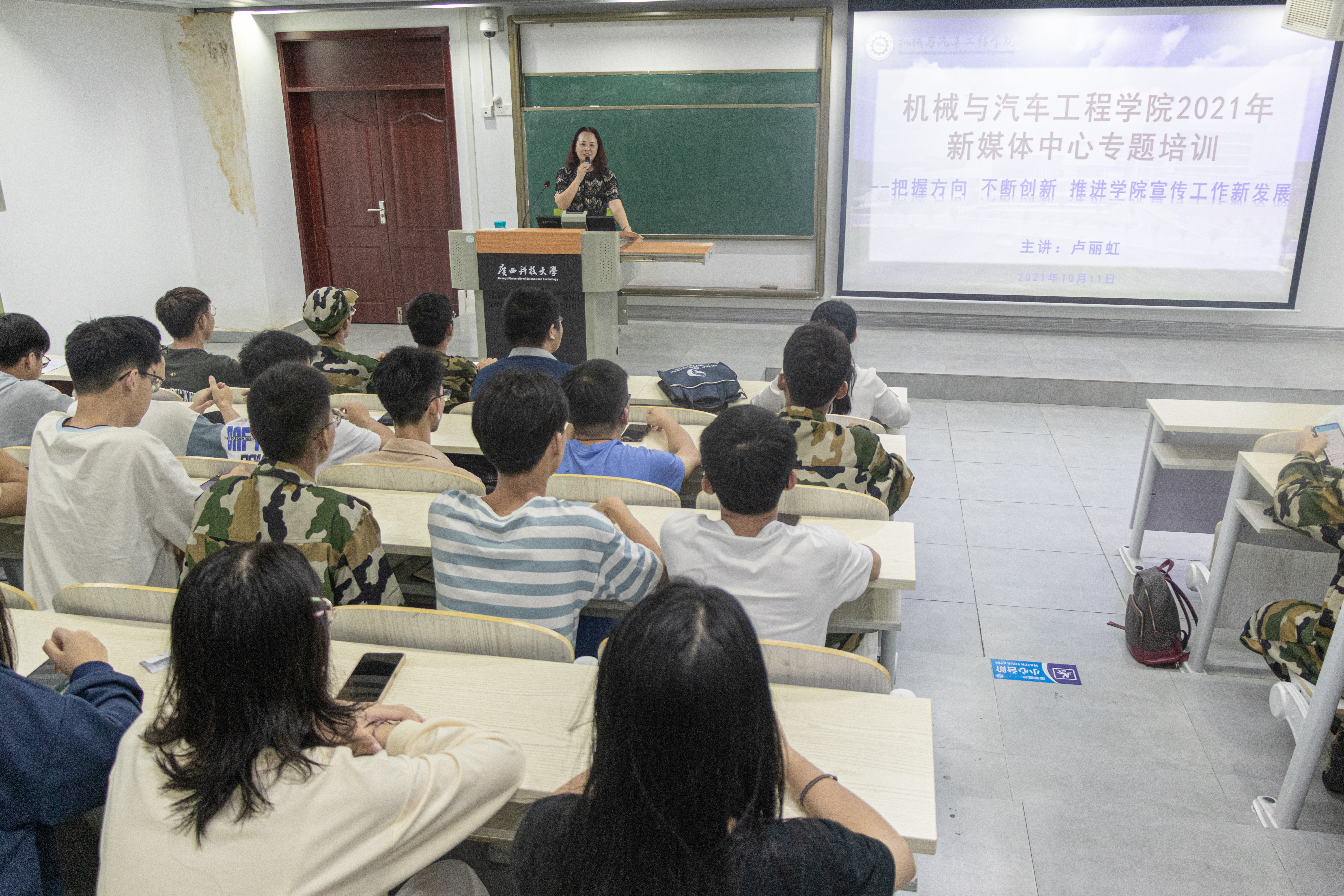 10月11日晚上,机械与汽车工程学院新媒体中心专题培训会在柳东校区T2-204召开。学院党委书记卢丽虹,学院党委副书记、纪委书记何敏,辅导员李雪琴以及新媒体中心全体成员、班级宣传委员参加了本次培训会。