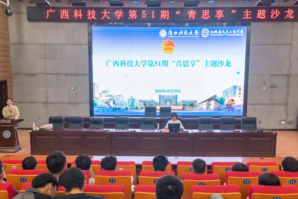 10月29日,由学校团委主办、机械与汽车工程学院承办的广西科技大学第51期“青思享”主题沙龙”分享会,在柳东校区T1-301报告厅举行。活动邀请了机械与汽车工程学院辛青青博士作了一场题为“我的大学”的专题报告。活动由学院团委书记、学工办主任关敏丹主持。