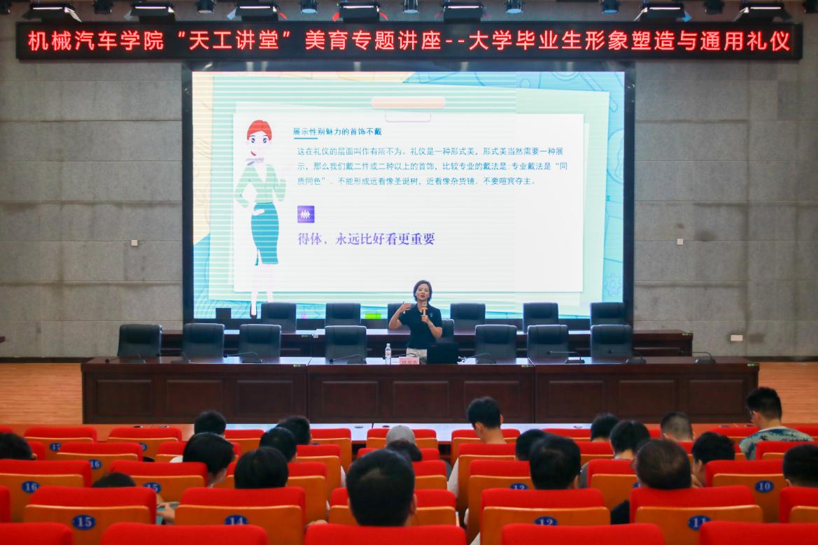 10月7日晚上,机械汽车学院邀请了自治区级普通话水平测试员,全国专业人才教育专家委员会礼仪委员,教育部“宏志助航计划”主讲教师,中国科教电影电视协会会员,医学部团委副书记覃芳芳做客天工讲堂,给2024届毕业生带来一场关于通用礼仪的专题讲座。讲座由学院专职辅导员李伟青主持,学院2024届毕业生近900余名学生分两个场次参加了讲座。