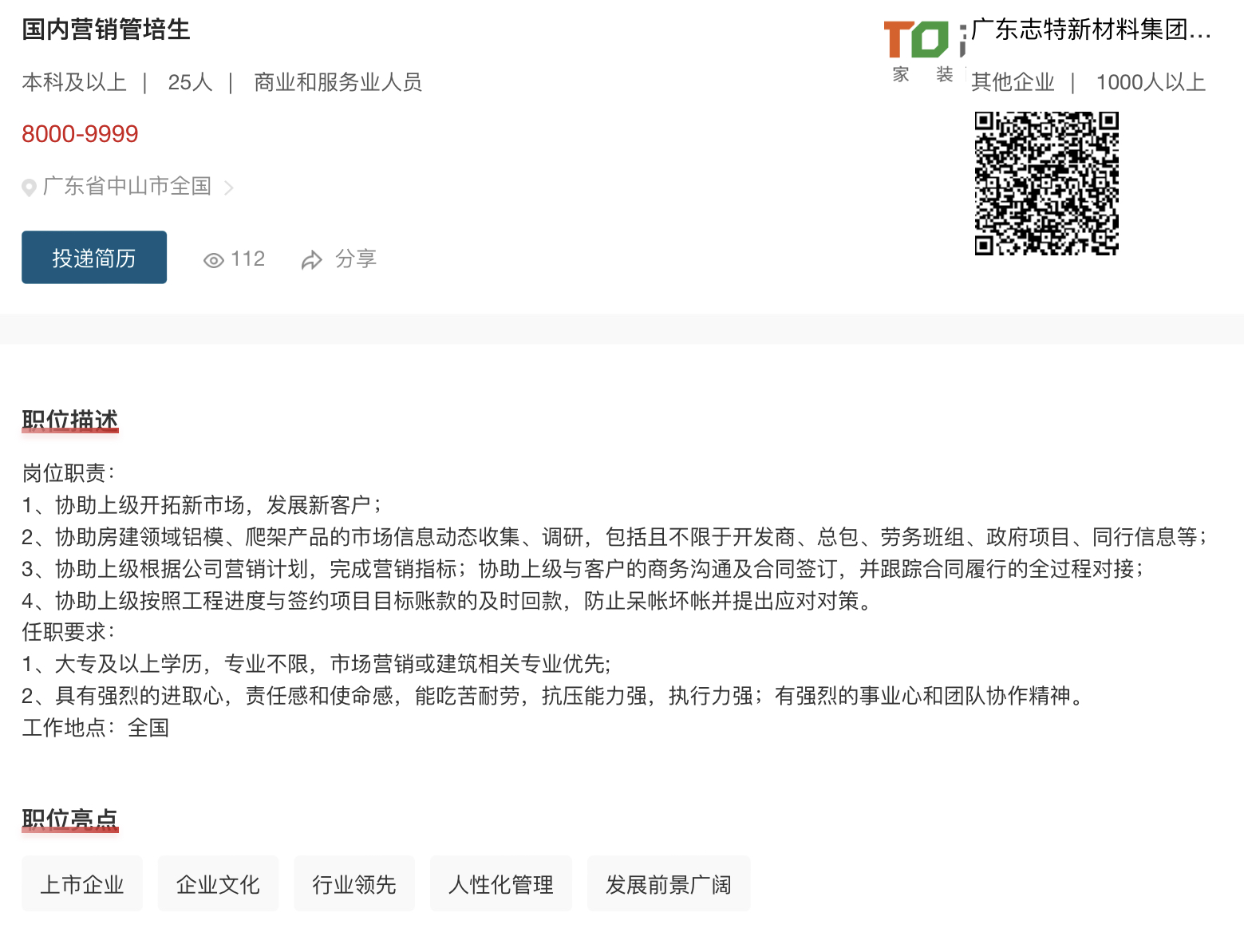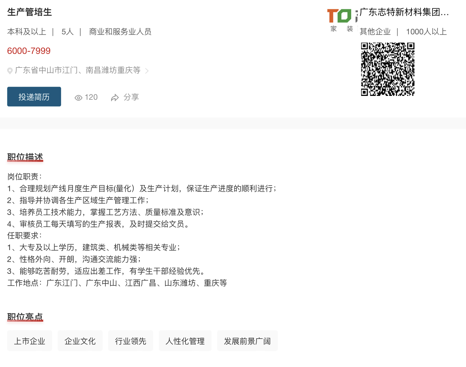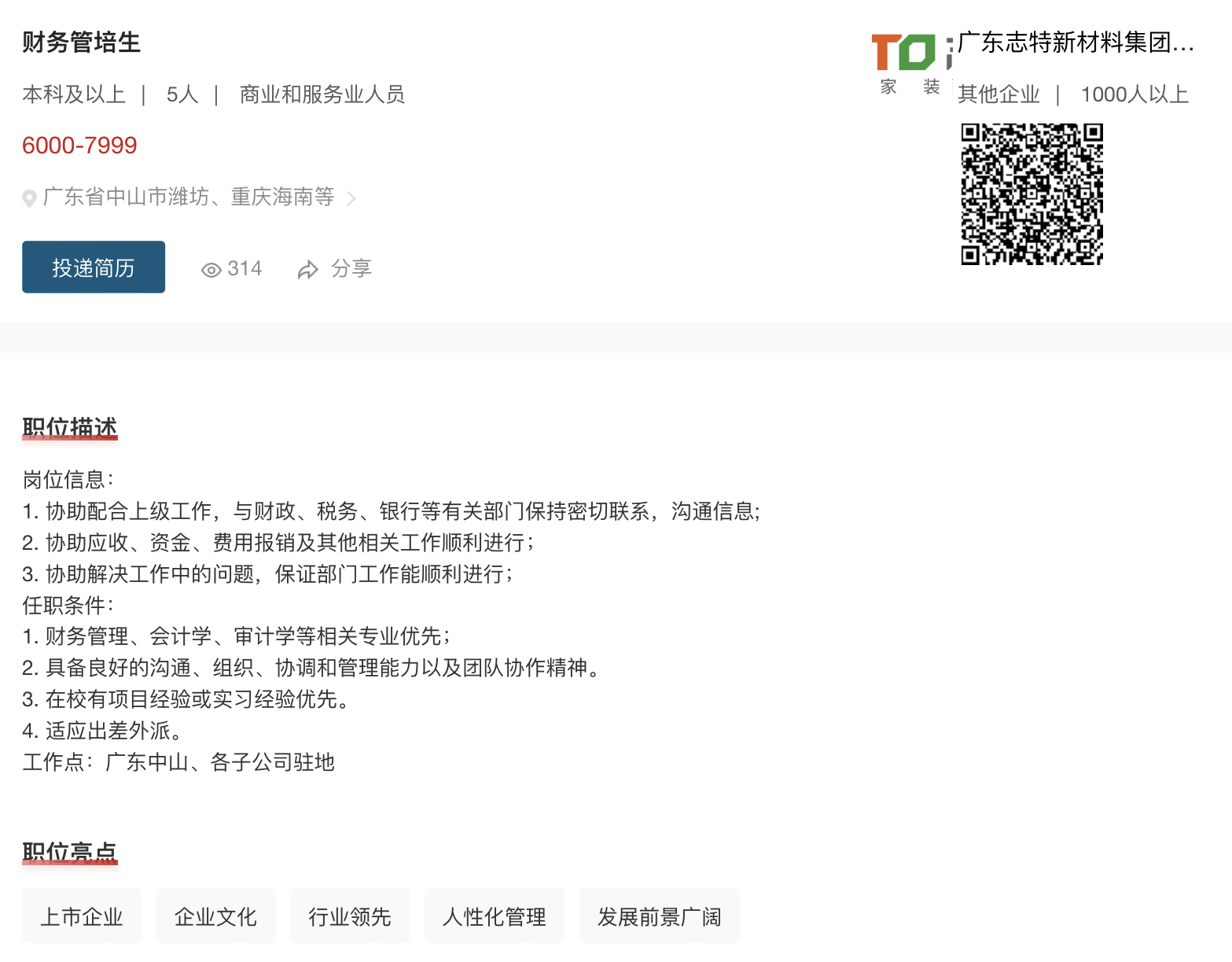 上市公司招聘,晋升体系完善,公司重视大学生人才培养,为应届毕业生提供转正后综合年收入 7-12 万、入职 2-3 年综合年收入 12-20 万的行业标杆市场竞争力薪资。