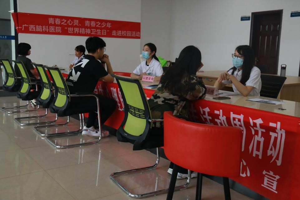 在活动现场,广西脑科医院医生、护士和机械汽车学院的老师们给同学们发放了精神卫生知识宣传资料。随后,脑科医院的医生为活动现场的学生进行了免费心理测试,并在现场向参加测试的学生解释了测试结果。同时,开展了现场心理咨询,为同学们解答困惑,拨开埋在同学们心头的“心理疑云”。同学们对现场心理测试和咨询给予了高度评价,纷纷表示在此次活动中受益匪浅,希望以后能有机会多参加心理健康活动。