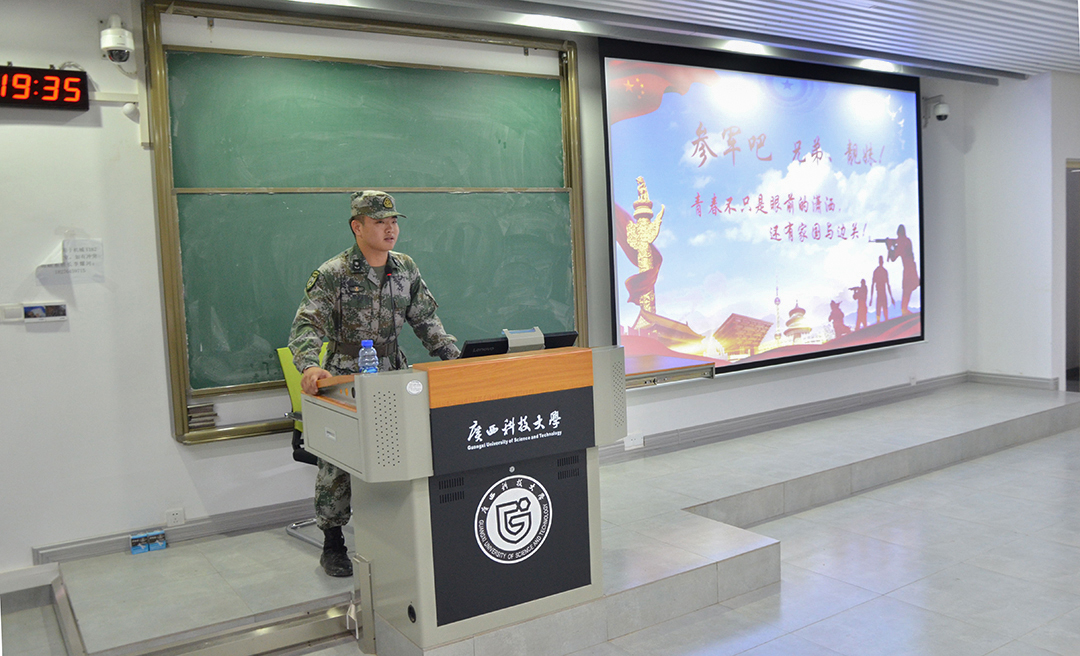 为深入贯彻党的十九大精神,全面深入做好征兵宣传工作,勉励我院学子崇军尚武、携笔从戎、建功军营。广西科技大学军武社分别于5月28日、29日、31日晚在柳东校区T2-105、T1-105教室为机械与交通工程学院学生进行了三期的征兵宣讲。
