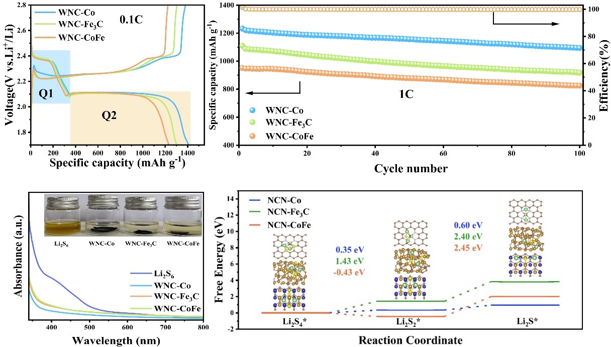 朱前程博士团队以废弃无纺布为前驱体,三聚氰胺为碳源和氮源,合成Co粒子催化生长氮掺杂碳纳米管修饰的碳化无纺布材料。这种自支撑结构的复合材料可以直接作为锂硫电池的中间隔层使用。氮原子掺杂的三维结构隔层可作为屏障为多硫化锂提供充足的存储空间和化学吸附位点,抑制穿梭效应。电化学测试和理论计算表明封装的Co纳米颗粒可有效提高多硫化物的催化活性,降低反应能垒,增强氧化还原反应动力学。