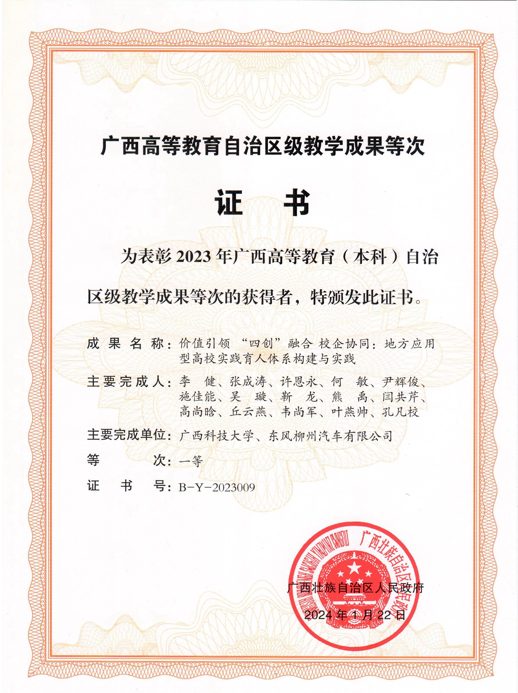 学院大力实施“产教融合,科教融汇”。与柳工、东风柳汽、广西汽车集团等企业协同创新、协同育人,学生创新能力、实践能力不断提升。2018年以来,学生在各类学科竞赛中获得省部级及以上奖励340余项,其中国家级奖励60余项。特别地,2018、2020年分别获得全国大学生方程式大赛燃油组和电动组亚军;2022、2023年中国国际“互联网+”创新创业大赛国家级银奖1项、铜奖3项,在广西赛区总决赛中获15金3银。育人成果先后获广西高等教育自治区级教学成果特等奖1项、一等奖6项。