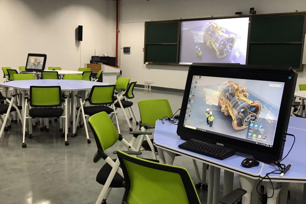 本次培训所使用的智慧教室及系统于2024年12月通过建设验收,集成了多项创新科技:工业机器人机械装调虚拟现实、新能源汽车构造原理虚拟现实、机械拆装VR教学系统以及智能制造VR体验等。通过VR机械拆装教学系统,学生可突破实体设备限制,在虚拟环境中完成精密仪器的360度拆解重组;智能制造VR体验平台则能模拟真实工厂环境,实现生产流程的沉浸式学习。特别配备的智能录播系统支持一键生成虚拟教学资源库,为打造线上线下联动的OMO教学模式提供技术保障。