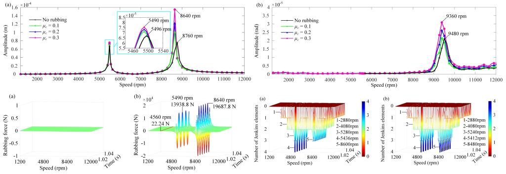 针对以上问题,李玉奇博士团队考虑螺栓连接界面在横向与扭转振动过程中的时变接触状态,建立了考虑界面接触的螺栓连接转子系统弯–扭耦合动力学模型,并引入Stribeck摩擦模型模拟转子-定子碰摩故障。通过数值仿真与实验揭示了快速启动与定转速稳态运行工况下界面滑移行为与碰摩故障耦合作用对转子动力学特性的影响机理。研究结果表明,界面滑移显著降低系统等效刚度,快速启动工况下不平衡力的增加进一步加剧了界面接触状态的演化,使转子振动幅值增大并强化弯–扭耦合效应。
