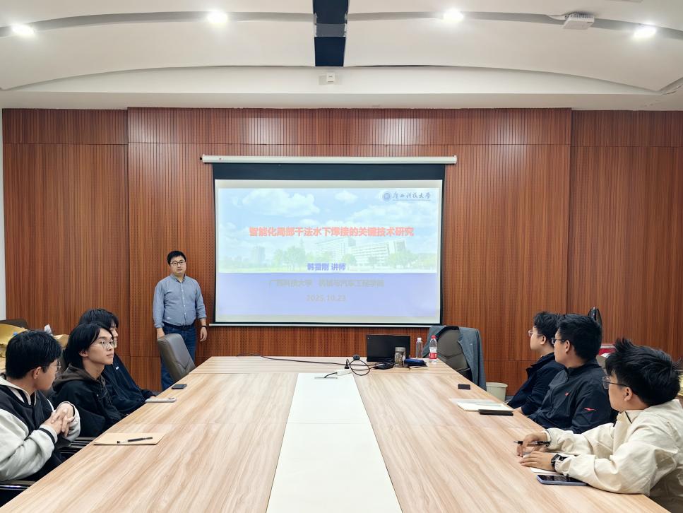 2025年10月23日,机械与汽车工程学院天工讲堂之研究生学术论坛第七十三讲在柳东校区H4第一会议室顺利举行。韩雷刚博士为研究生们作了题为《智能化局部干法水下焊接关键技术研究》的专题讲座。本次报告围绕智能化水下焊接的关键技术、水下焊接机器人在核电中的应用以及未来研究展望展开阐述,拓宽了研究生在水下焊接智能化领域的前沿认知。