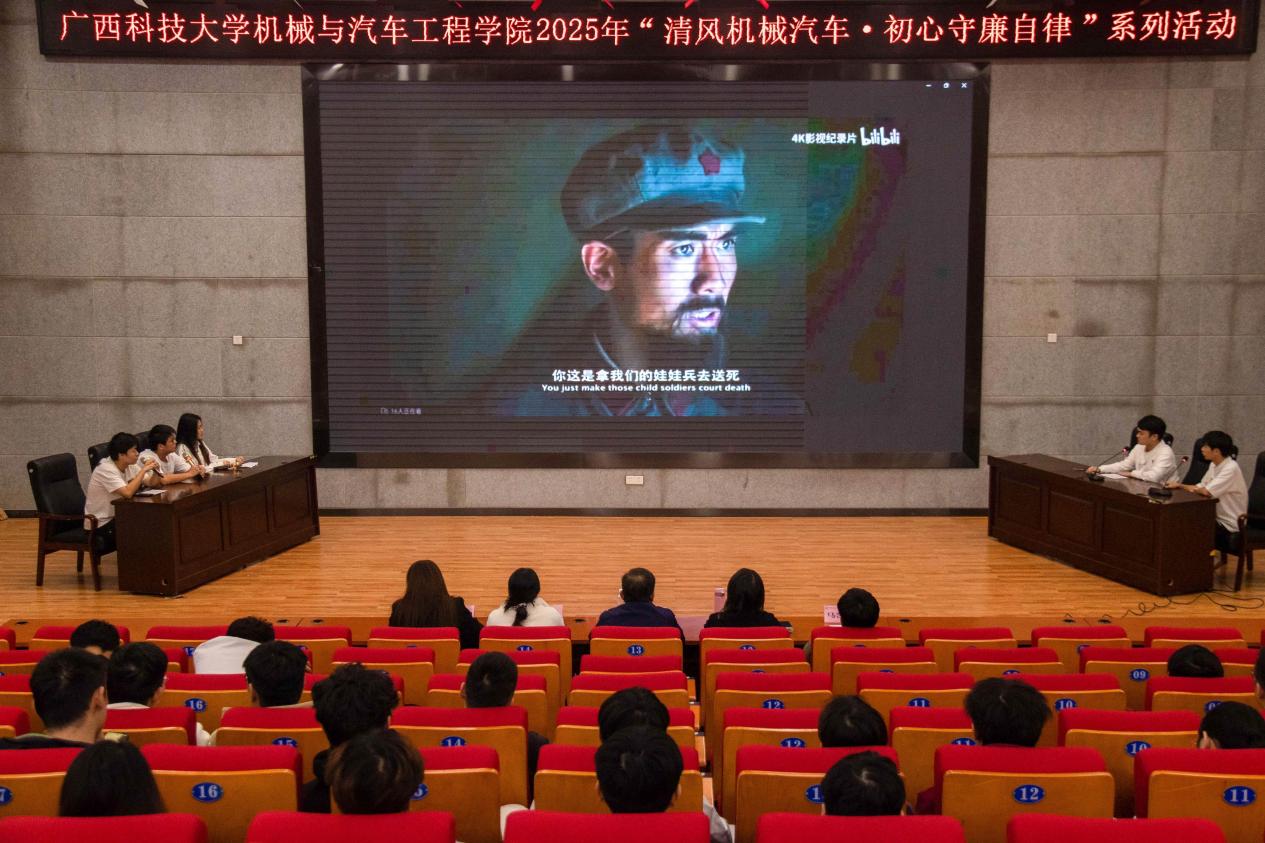 11月18日下午,机械与汽车工程学院2025年“清风机械汽车 初心守廉自律”系列活动之廉政电影配音比赛在柳东校区T1-303多功能报告厅成功举办。学院党委副书记、纪委书记杨年炯及辅导员古思敏、龙雨林、马凯越、徐艺珈出席活动并担任评委。