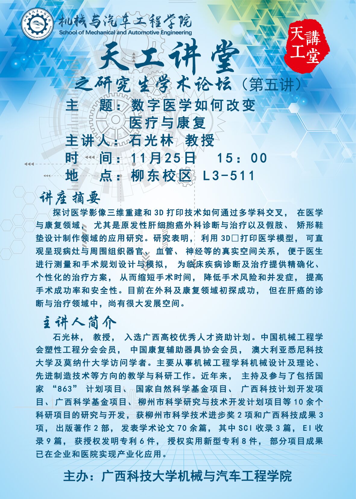 石光林,教授,入选广西高校优秀人才资助计划。中国机械工程学会塑性工程分会会员,中国康复辅助器具协会会员,澳大利亚悉尼科技大学及莫纳什大学访问学者。主要从事机械工程学科机械设计及理论、先进制造技术等方向的教学与科研工作。近年来,主持及参与了包括国家“863”计划项目、国家自然科学基金项目、广西科技计划开发项目、广西科学基金项目、柳州市科学研究与技术开发计划项目等10余个科研项目的研究与开发,获柳州市科学技术进步奖2项和广西科技成果3项,出版著作2部,发表学术论文70余篇,其中SCI收录3篇,EI收录9篇,获授权发明专利6件,授权实用新型专利8件,部分项目成果已在企业和医院实现产业化应用。