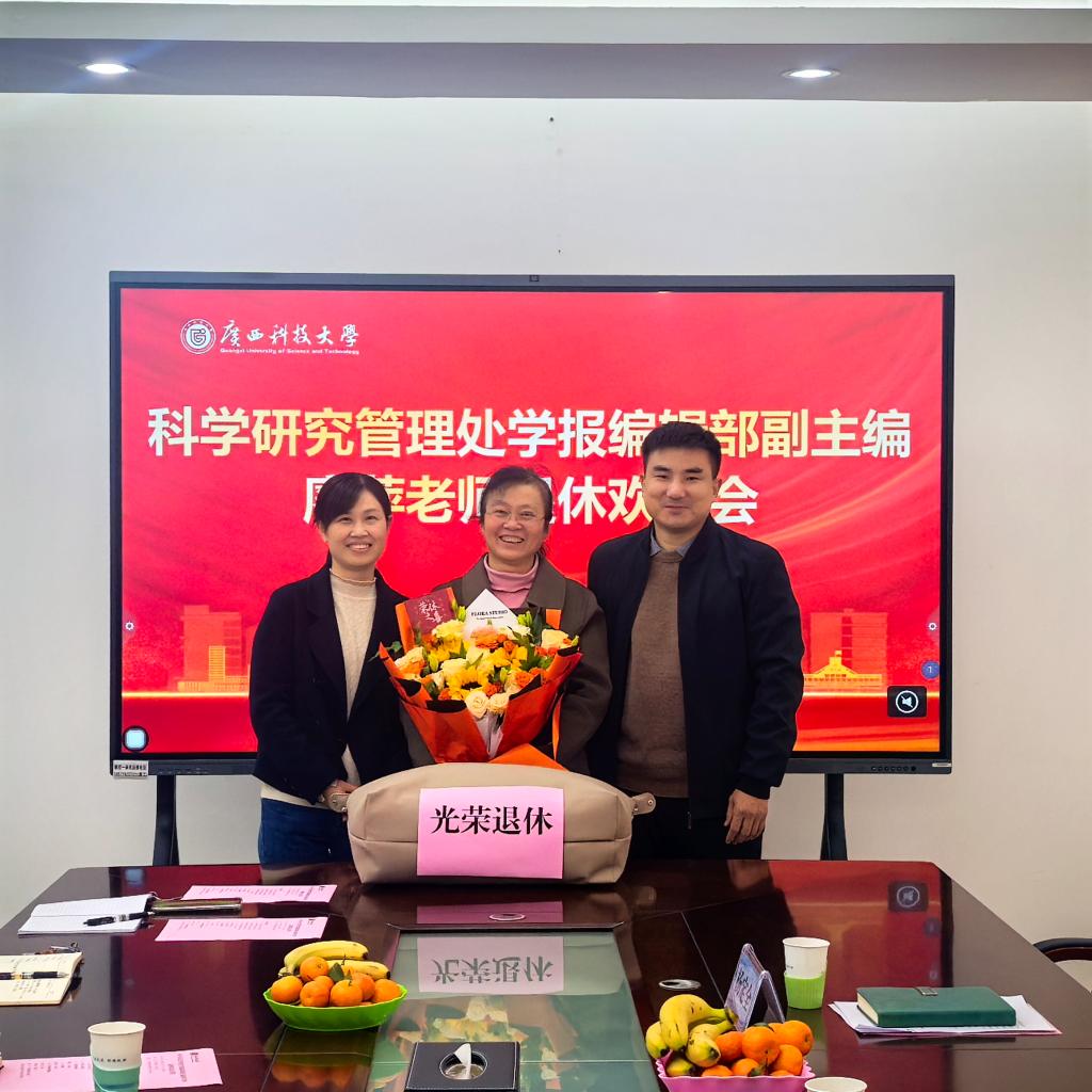 仪式上,处领导为廖萍同志送上鲜花和退休纪念品,并合影留念。与会人员围桌畅谈,重温并肩共事的难忘岁月,纷纷表达不舍与祝福。杨小龙高度肯定廖萍老师在学报编辑工作中作出的成绩与奉献,并代表科研处对其数十年如一日的辛勤付出致以崇高敬意。此次仪式简约而真挚,衷心祝愿廖萍老师退有所乐、康泰常伴,期盼她常“回家”看看,继续为科研处、学报编辑部发展建言献策、添彩助力。