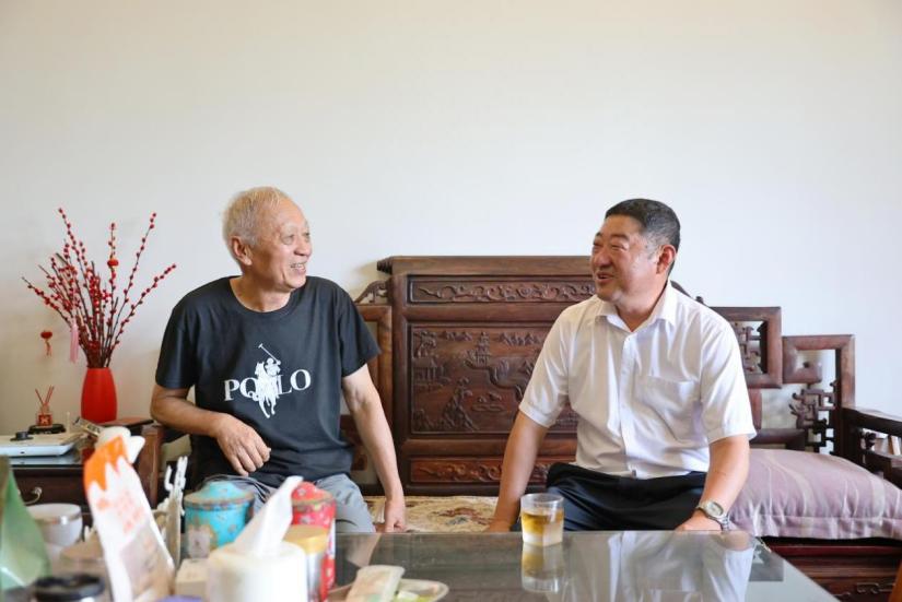 学校党委副书记、校长刘宝臣(右)慰问退休老党员