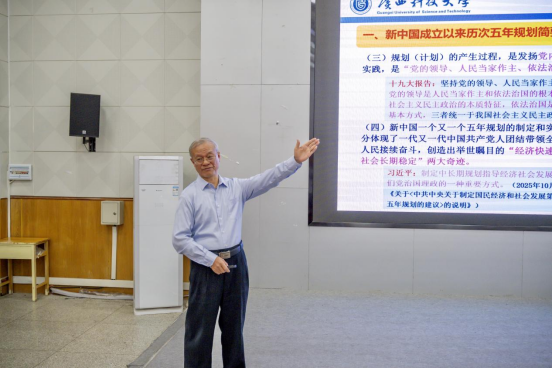 本次报告会特邀“银龄宣讲团”骨干专家、原学校党委书记覃伟年教授作专题辅导。覃伟年以“学习贯彻党的二十届四中全会精神,奋力谱写‘十五五’发展新篇章”为题,为青年学子带来了一场精彩而深刻的专题报告。报告中,他系统回顾了新中国成立以来历次五年规划的发展历程,深入阐释了党的二十届四中全会的核心要义以及“十五五”规划的重大战略意义。围绕同学们普遍关注的学习困惑、职业规划与人生选择等现实问题,覃伟年以深入浅出的语言将理论与实际紧密结合,让理想信念真正走进青年的日常生活与成长路径。他勉励广大青年学子坚定理想信念,主动将个人理想融入国家发展大局,在“十五五”建设的新征程中勇担时代使命,积极贡献青春力量。