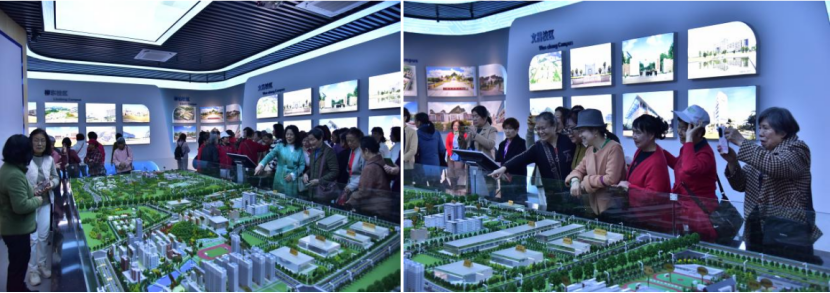 退休女职工们实地参观文昌校区,感受学校日新月异的变化和良好的育人氛围。在讲解员的引导下,参观了学校规划馆,大家通过丰富的图文展板、精致的沙盘模型,全面了解了学校筹建以来的奋斗足迹、办学成就以及未来的宏伟蓝图。从建校初期的筚路蓝缕到如今多校区协同发展的崭新格局,老同志们驻足观看,感慨万千,为学校近年来在学科建设、人才培养和校园基础设施建设方面取得的突破性成就深感自豪。在工作人员的引领下,大家还参观了文昌校区办学成果展厅、宗元广场,并深入参观学生宿舍楼、教学楼、行政办公楼等场所。每到一处,老同志们不时相互交流讨论、合影拍照,对学校的热爱、自豪之情溢于言表,所到之处洋溢着欢乐祥和的气氛。