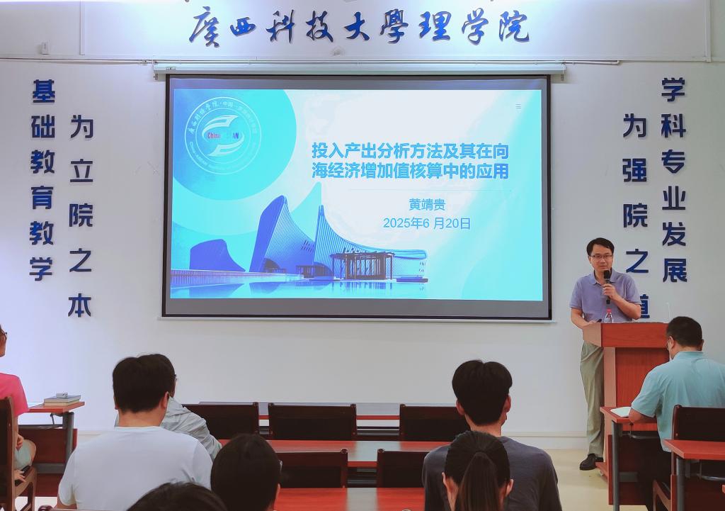 6月20日,广西财经学院正高级统计师黄靖贵在二教306会议室作题为《投入产出分析方法及其在向海经济增加值核算中的应用》的学术报告。报告会由理学院副院长霍海峰主持,相关专业教师及2024级研究生50余人参加本次报告会。