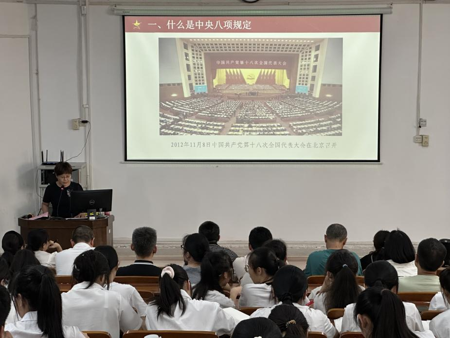 尹丽详细解读了中央八项规定及其精神内涵、核心要义和实施细则,并结合典型案例,深入剖析了违反中央八项规定精神的具体表现。她强调,全体党员要经常开展思想政治体检,切实筑牢作风建设的思想防线,不断增强纪律规矩意识。
