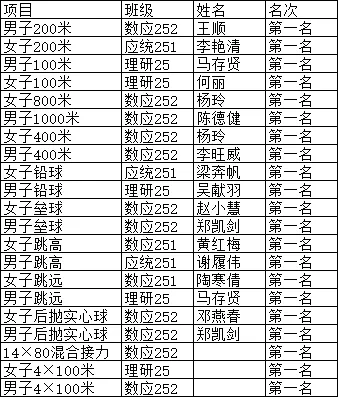 闭幕式上,领导老师为获奖班级团体进行颁奖,第一名数应252,第二名数应251,第三名应统251,第四名应统252。各班同学在各项目比赛你追我赶,营造良好的体育竞技氛围,王顺等15名同学在比赛中荣获第一名。