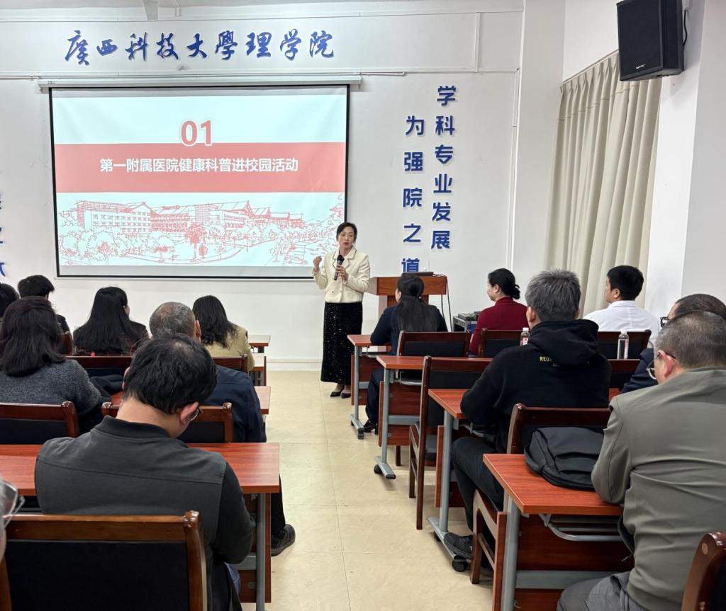 为增强教职工健康管理意识,促进身心健康,1月16日,理学院与第一附属医院在第二教学楼306会议室共同举办了“健康科普进校园”活动。本次活动主要包含三项内容:一是针对体检常见问题,由呼吸内科覃灏副主任医师开展健康知识专题讲座;二是由陈瑞副院长带领的专家团队,为教职工提供一对一的个性化体检报告解读;三是现场提供甲状腺结节检查、血压测量、中医体验等便民服务。