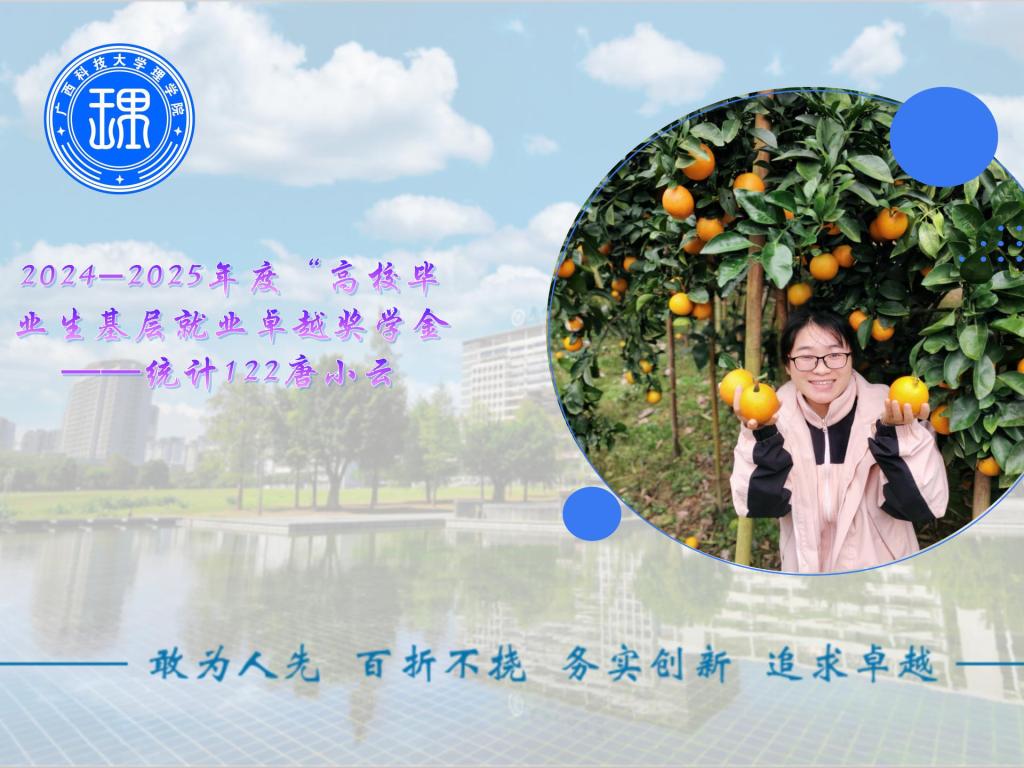 唐小云,共产党党员,广西容县人,2016年6月毕业于广西科技大学理学院统计学专业,同年8月到广西容县统计局普查中心工作,现任普查中心副主任。怀揣着服务基层、建设家乡的赤子情怀,她毅然选择回到广西,扎根于容县统计局这一基层岗位。一直以来,她始终坚守在数据统计的第一线,奋战在脱贫攻坚的最前沿,以高度的责任感和强烈的使命感,在平凡的岗位上做出了不平凡的业绩,生动诠释了新时代高校毕业生扎根基层、砥砺奋斗的卓越风采。2025年荣获2024-2025年度“高校毕业生基层就业卓越奖学金”。