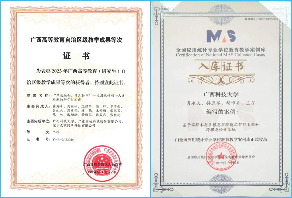 近年来,结合地方工业、交通、医疗、金融等数据密集型行业的发展特点,注重发挥统计学科优势和智力优势,主动对接地方需求,“产、学、研”协同育人培养成效明显,与柳州市统计局、国家统计局柳州调查队、广西柳工机械股份有限公司、广东泰迪智能科技股份有限公司等地方企事业单位合作创新,建立共享机制,校企合作制定了应用型人才培养方案、出版教材20部、建成网络课程资源6门,建立 18 个校外实践基地,其中自治区级创新创业教育暨联合培养基地2个,承担各类科研项目110多项,其中国家级科研项目14项,省部级项目48项,科研经费达1600余万元。校企协同开展案例库建设项目,实现了研究生教育教学案例首次入选全国应用统计专业学位教育教学案例库,也是我校师生作品首次入选全国专业学位教育教学案例库。