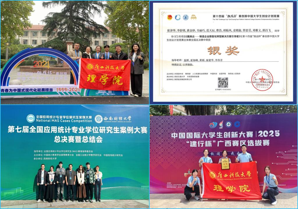 学院坚持以赛促学理念,学生专业素质和创新实践能力显著提高。建立了“逐步推进、分层深化、综合应用”实践能力培养链,有效组织学生参加各项科技创新竞赛,先后获得第十四届“挑战杯”中国大学生创业计划竞赛全国决赛主体赛银奖1项,中国国际“互联网+”大学生创新创业大赛“数广集团杯”广西赛区金奖3项。近5年来,在学科竞赛领域屡创佳绩,参与率和获奖率均为100%,共获得省级以上奖励210项(其中,国家级113项),在全国大学生市场调查与分析大赛、全国大学生统计建模大赛和全国应用统计专业学位研究生案例大赛中均实现了全国一等奖的突破,有效提升了学生的实践创新能力,就业率97%以上。